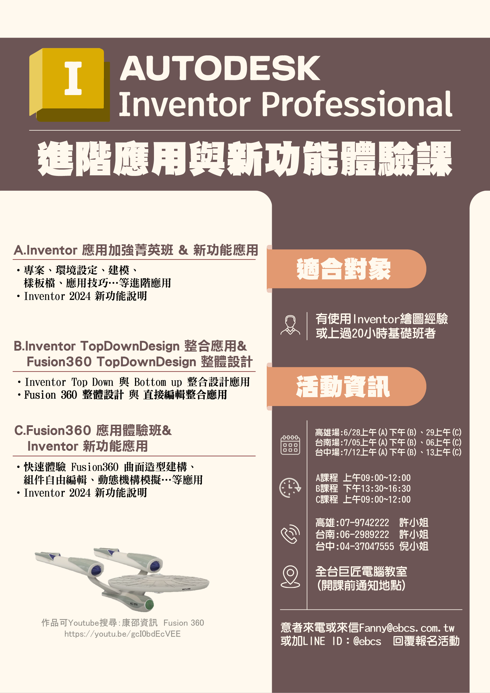 - 當您完成Inventor基礎教育訓練;也經過一段時間練習,是否仍有指令使用連貫不起來、好像缺少某些設定、要開始規劃設計樣板....等等的需求,本課程進一步讓您串聯各指令功能應用、整合選項設定、制定樣板檔,提升您的軟體使用流暢度與效率。