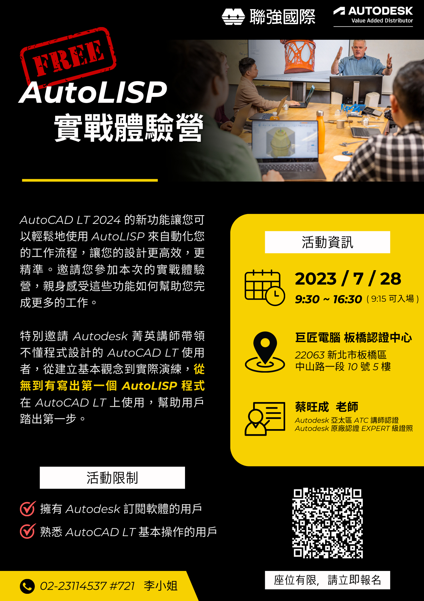 7月28日【聯強國際】AutoLISP實戰體驗營-帶領AutoCAD LT使用者從無到有寫出第一個AutoLISP程式