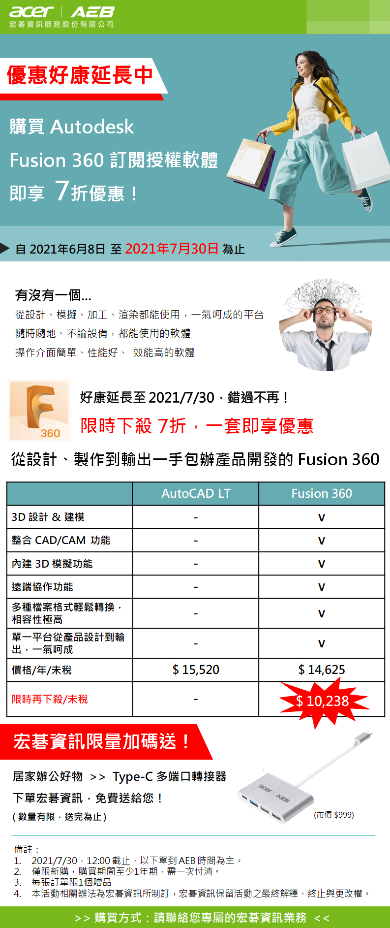 宏碁資訊:Fusion 360 訂閱授權軟體即享 7 折優惠!限量加碼送 Type-C 多端口轉接器